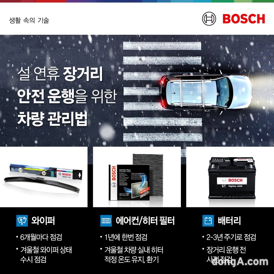 보쉬카서비스(BCS) 자동차 정비 전문가들은 올해처럼 날씨 예측이 불가능하고 한파와 폭설이 잦은 겨울철에는 설 연휴 장거리 여행 전에 안전 운행을 위해 와이퍼, 에어컨 및 히터 필터, 배터리 필수 점검 및 교체만으로도 효과적으로 대비할 수 있다고 조언한다. 하이브리드 및 전기차도 예외 없이 정기적인 점검 및 교체가 필요하다는 의견이다.