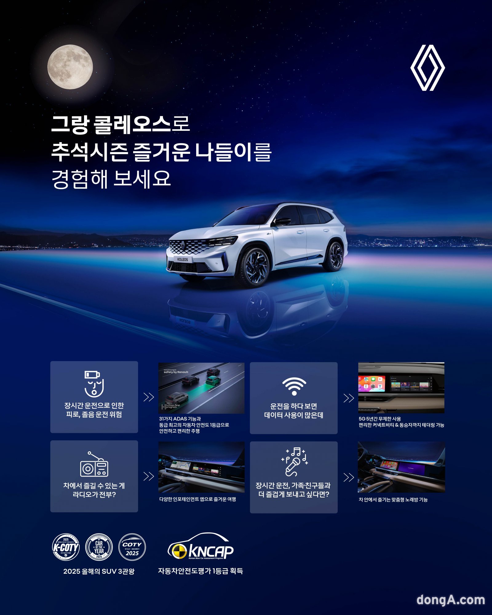 이와 함께 그랑 콜레오스, 세닉 E-테크 일렉트릭, 아르카나의 시승 또는 구매상담 및 계약 중 한가지를 진행한 고객에게는 추첨을 통해 ▲주유 상품권 10만 원권(30명) ▲다이슨 무선 청소기(2명) ▲6박 7일의 르노코리아 차량 장기 시승권(10명) 등 푸짐한 경품을 제공한다.