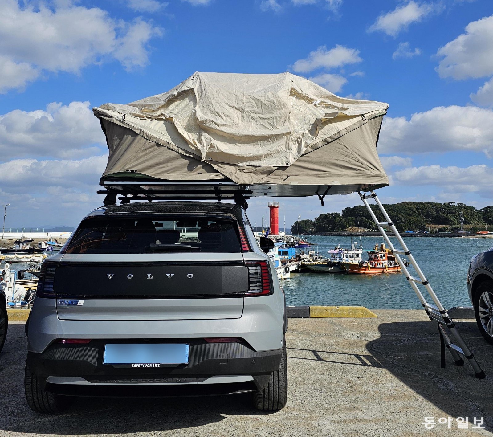 이달 초 충남 보령시의 한 바닷가에서 볼보 EX30 크로스컨트리 루프 텐트를 펼친 모습(위쪽 사진)과 급속 충전 중인 모습(아래 사진). 보령=김재형 기자 monami@donga.com이달 초 이러한 궁금증을 해소할 기회가 생겼다. 1박 2일 일정으로 서울 은평구에서 충남 보령시 원산도로 출발해 루프톱 텐트가 장착된 이 시승차로 친구들과 낚시를 즐기며 실제 아웃도어 라이프에 얼마나 적합한지 검증해 보기로 했다.