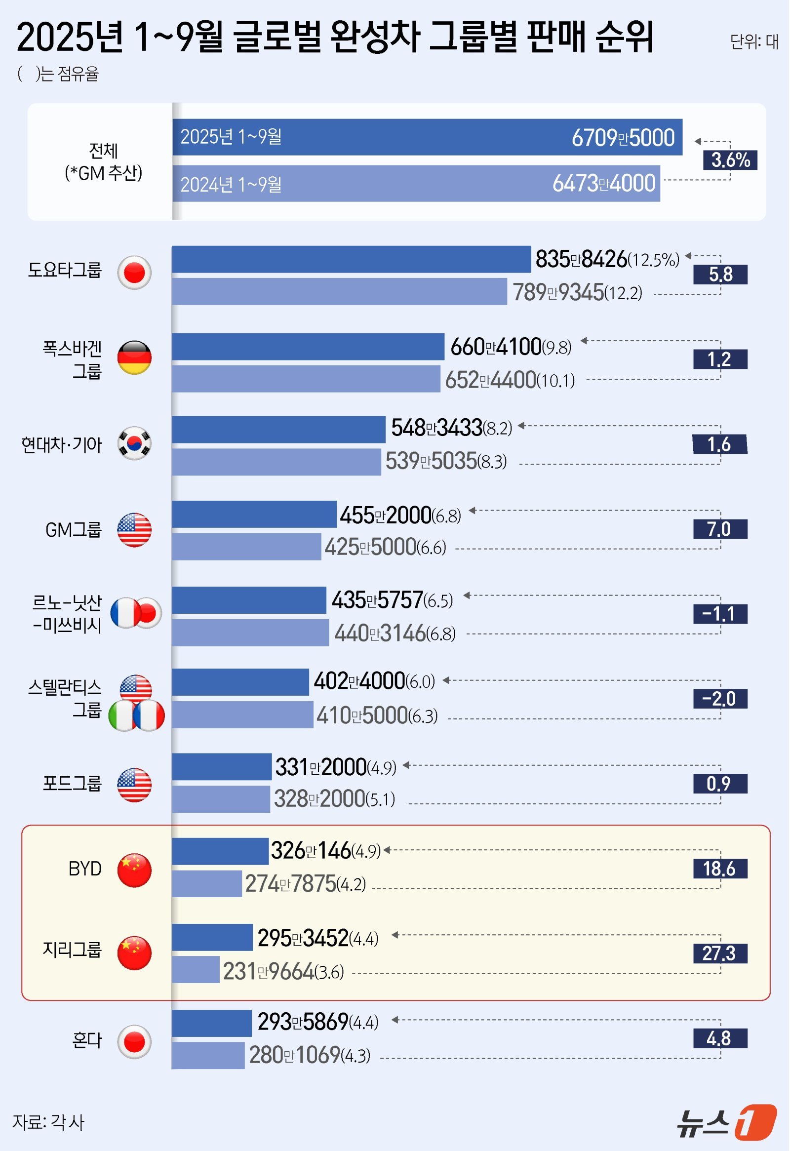 2일 뉴스1이 올해 1~9월 글로벌 완성차 그룹별 판매 실적을 분석한 결과 BYD는 전년 동기 대비 18.6% 증가한 326만 146대로 8위를 기록했다. 같은 기간 지리그룹의 판매량은 27.3% 증가한 295만 3452대로 BYD 다음 자리를 차지했다.
