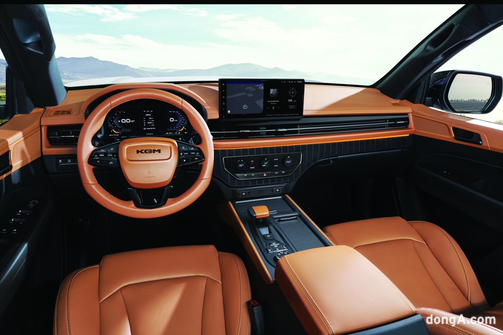 12.3인치 디지털 클러스터와 KGM 링크 내비게이션은 다양한 주행 정보를 높은 시인성으로 전달하며, 전자식 변속 레버(SBW)와 전자식 파킹 브레이크(EPB)를 적용해 센터 콘솔의 공간 활용성과 조작 효율성을 함께 높였다. LCD 다이얼 타입의 듀얼존 풀오토 에어컨은 직관적인 조작이 가능해 사용 편의성을 향상한다. 여기에 스웨이드 퀼팅 소재의 IP 패널, 트리코트 소재의 신규 선바이저(슬라이딩 기능 포함), 엠비언트 라이트가 고급스러운 실내 분위기를 완성했다.