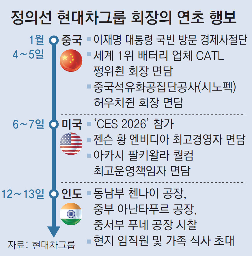 정의선 현대자동차그룹 회장(앞줄 오른쪽)이 인도 중부 지역에 있는 아난타푸르 공장을 찾아 신입사원 교육훈련 장비를 점검하고 있다. 정 회장은 12, 13일 인도 각지에 있는 현대차그룹 생산 시설을 찾아 현장 상황을 점검하고 임직원과 가족들을 격려했다. 현대차그룹 제공정의선 현대자동차그룹 회장이 새해 초부터 이들 3개국을 쉴 새 없이 방문하며 ‘수소 생태계’, ‘자율주행’ 등 차세대 먹거리 구상에 나섰다. 글로벌 리더 기업 대표들을 만나 협력 방안을 구상하는 한편 시장 상황도 직접 점검했다.