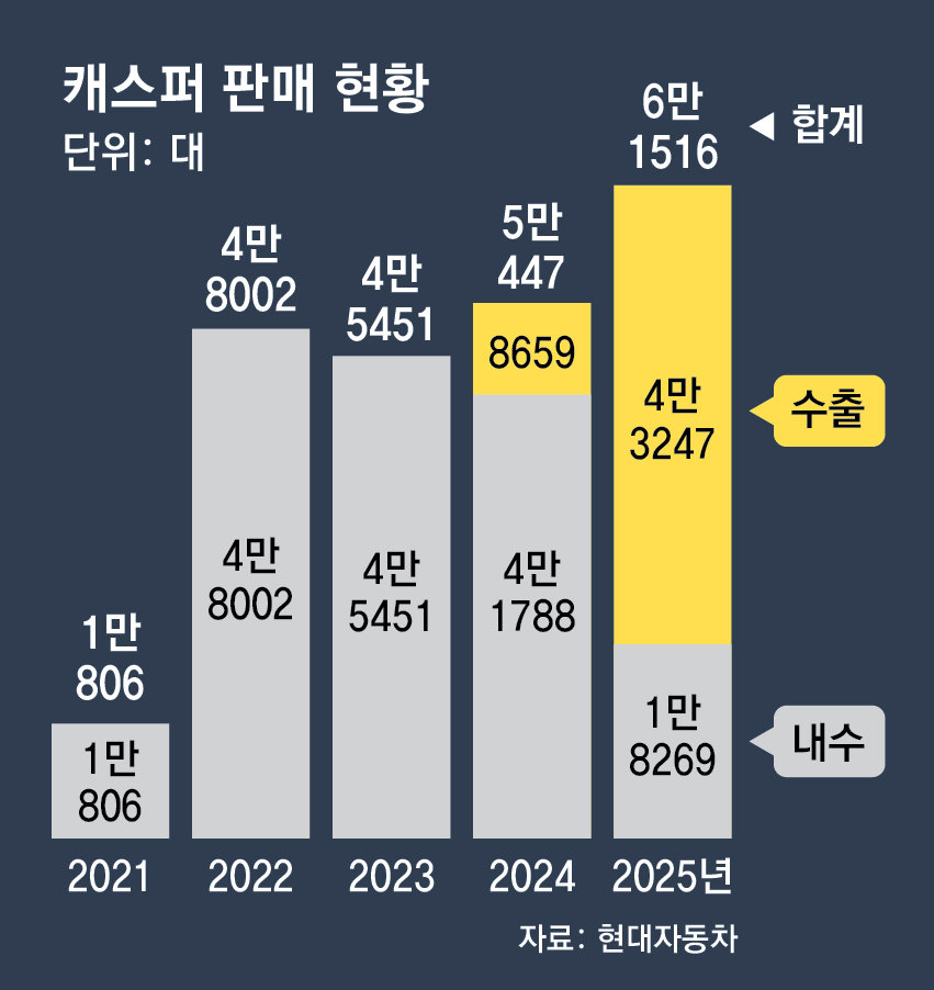 유럽 시장 흥행이 결정적이었다. 세계 전기차 수요 정체 속에서도 유럽 소비자들은 실속형 전기차 캐스퍼 일렉트릭을 선호했다. 2025년 유럽 판매량은 2만6851대로 현대차 주력 전용 전기차 아이오닉5(N 포함, 1만7749대)를 크게 앞질렀다.
