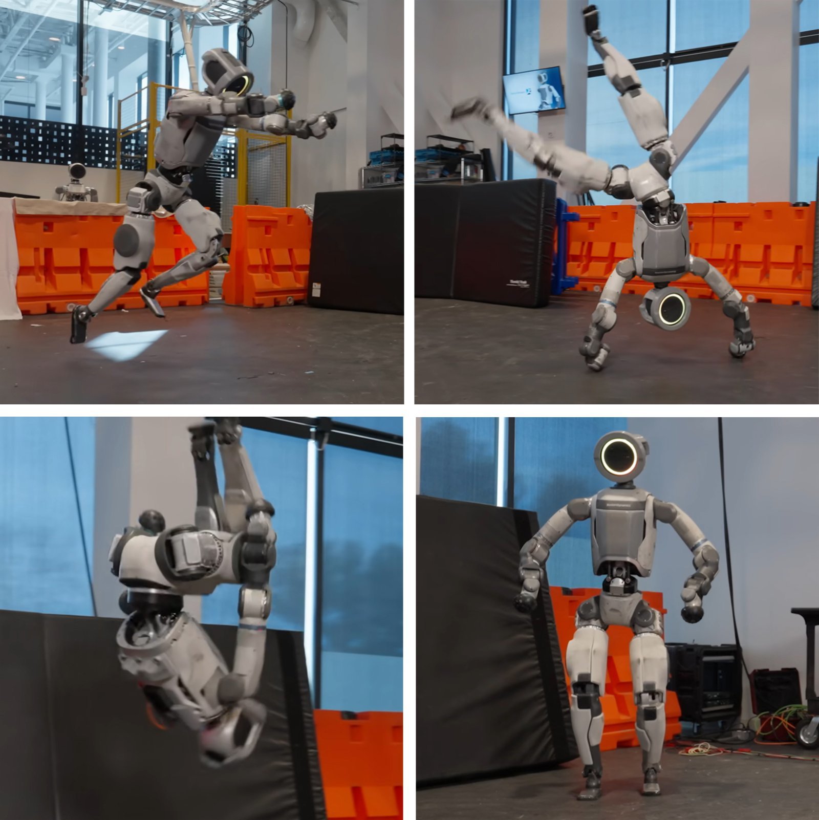 7일 공개된 영상에서 보스턴 다이내믹스의 휴머노이드 로봇 아틀라스가 옆돌기, 백텀블링 등을 하고 있다. 스스로 도움닫기를 한 후(왼쪽 위 사진) 두 손을 사용해 옆돌기를 성공시키거나(오른쪽 위 사진), 공중 백텀블링을 성공한 뒤(왼쪽 아래 사진) 안정적으로 착지하는 모습(오른쪽 아래 사진) 등이 공개됐다. 보스턴 다이내믹스 제공아틀라스는 영상에서 숙련된 체조 선수처럼 옆돌기와 백텀블링을 잇달아 수행한 뒤 두 발로 한 번의 반동도 없이 착지하는 모습을 선보였다. 도움닫기를 하는 순간과 옆돌기 직전 두 다리를 순서대로 강하게 땅에 디뎌 탄력을 이용하는 모습, 백텀블링 직전 발끝을 이용해 공중에 도약하는 모습 등이 사람의 운동 동작과 거의 차이가 없었다.