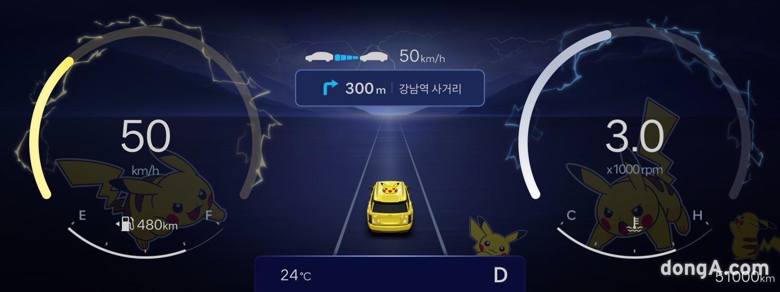 현대자동차는 23일 포켓몬코리아와 손잡고 차량 인포테인먼트(ccNC, 연결형 차량 컴퓨터 시스템) 디스플레이용 신규 테마를 공개했다고 밝혔다. ‘피카츄 전광석화’와 ‘메타몽 월드’ 두 가지 디자인이다.