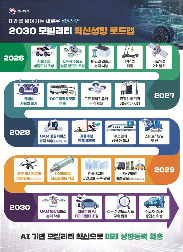 홍지선 국토부 제2차관은 “산업 전 분야에서 AI 전환으로 혁신 속도가 전례 없이 빨라지는 가운데, 이번 로드맵이 대한민국 모빌리티 산업에 새로운 이정표가 될 것”이라며 “국민들이 미래 모빌리티를 하루빨리 일상에서 만날 수 있도록 세부 과제들을 속도감 있게 추진하겠다”고 말했다.